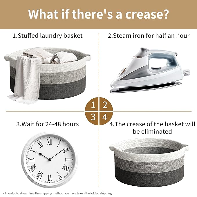 • Note: Blankets basket comes folded and may have creases. Fully fill the rope basket with towels or clothes and wait for 1-2 days will help reshape the blanket basket. Alternatively, use steam or ironing for a quick reshape the laundry basket
