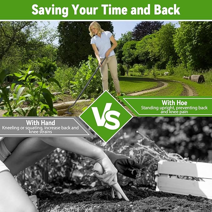 • 55 Inch Long Handle for Maximum Reach, Minimum Strain: Crafted for comfort and leverage, the extra-long 55-inch handle allows users to work while standing upright, greatly reducing back, knee, and shoulder fatigue. This extended reach is ideal for taller gardeners, larger plots, or anyone who wants to maintain good posture while cultivating