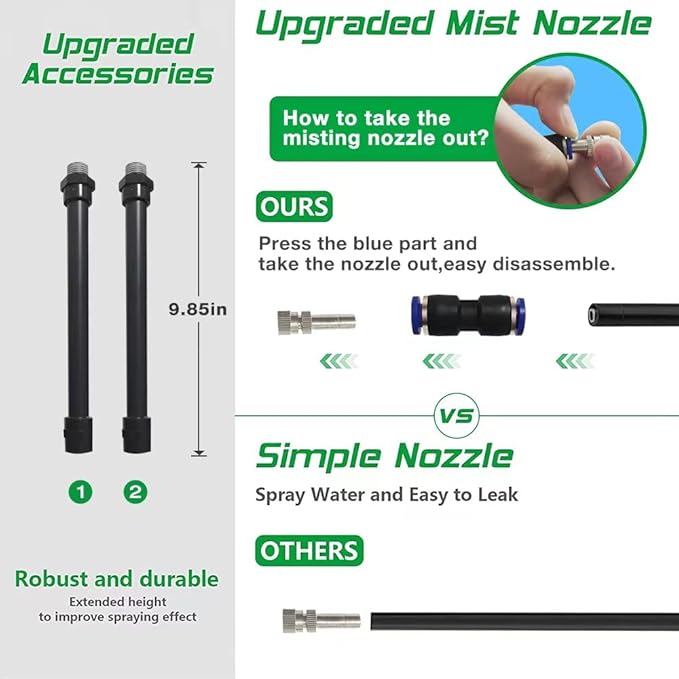 • [High-Quality Materials] The Tripod base of the standing mister is made of high-quality and durable stainless steel. The newly upgraded nozzle features excellent leak-proof and misting performance, allowing you to enjoy wonderful outdoor moments during the hot summer days.
