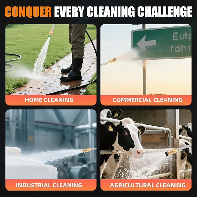 • 𝐂𝐨𝐦𝐩𝐫𝐞𝐡𝐞𝐧𝐬𝐢𝐯𝐞 𝐂𝐥𝐞𝐚𝐧𝐢𝐧𝐠 - This pressure washer has 4 quick-connect nozzle heads (0°, 25°, 40°, and soap) ranging from high-impact water jets to soft dispersion, perfect for cleaning decks, cars, house exteriors, outdoor furniture, and preparing your house exterior for painting. It can effectively remove dirt and grime from any surface in a short time.