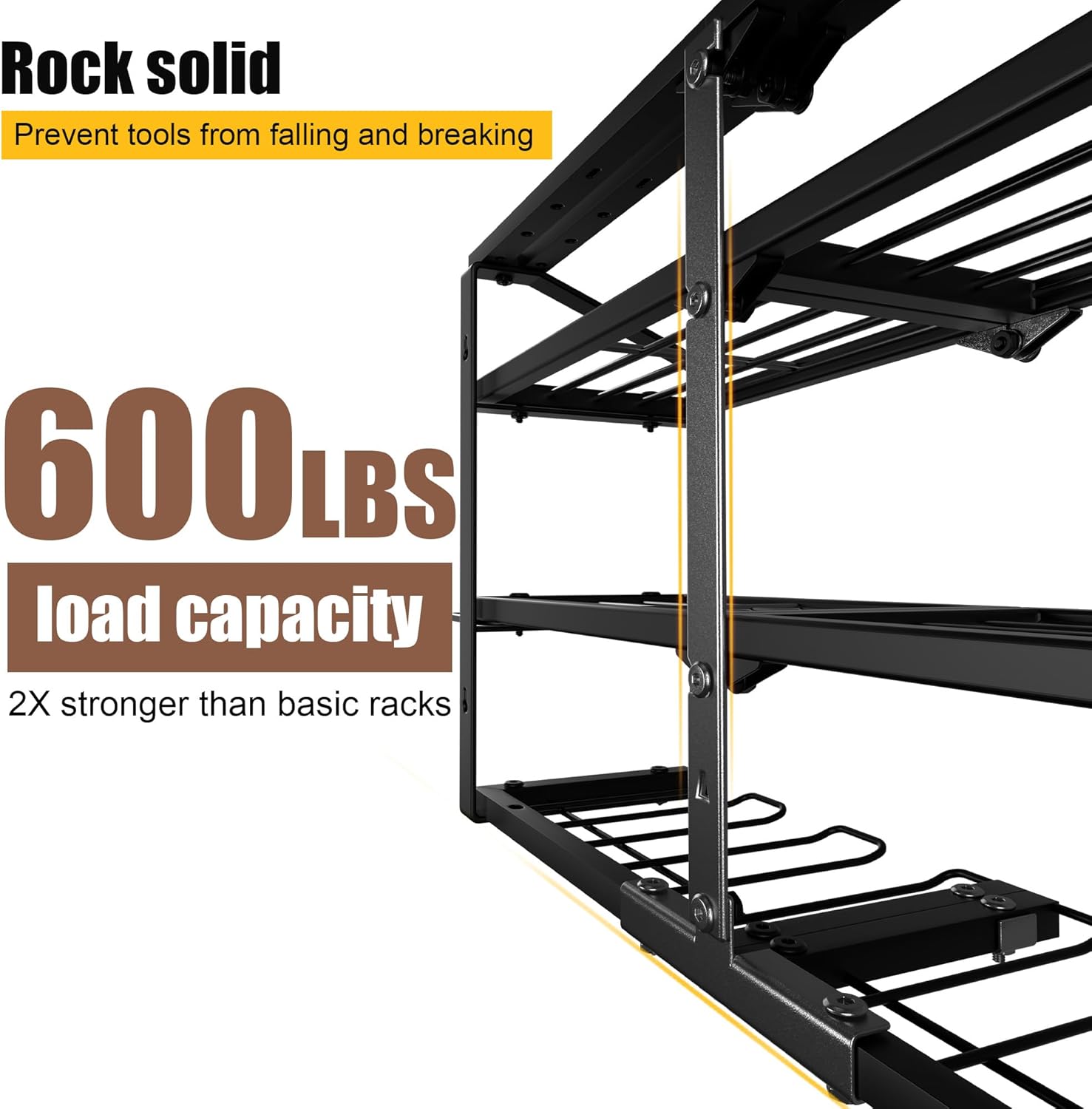 • Heavy-Duty&Durable: Crafted from thickened industrial-grade steel with reinforced full-frame welding, our power tool rack cradles every tool like a reliable partner, supporting 600 lbs. Rust-resistant black powder-coated finish ensures lifelong durability, resisting scratches, rust, and deformation.