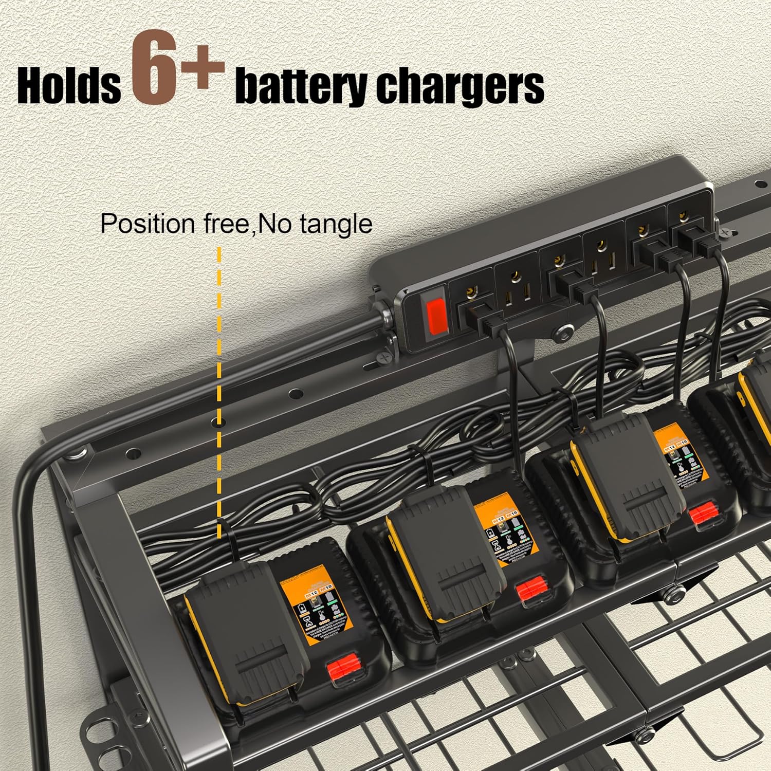 • Built-in 6-Outlet Power Strip: The Spampur Power Tool Organizer with Charging Station charges up to 6 power tools simultaneously. Features an angled panel for easy-access plugging. Mounted 3.2" above mesh shelf for space efficiency.