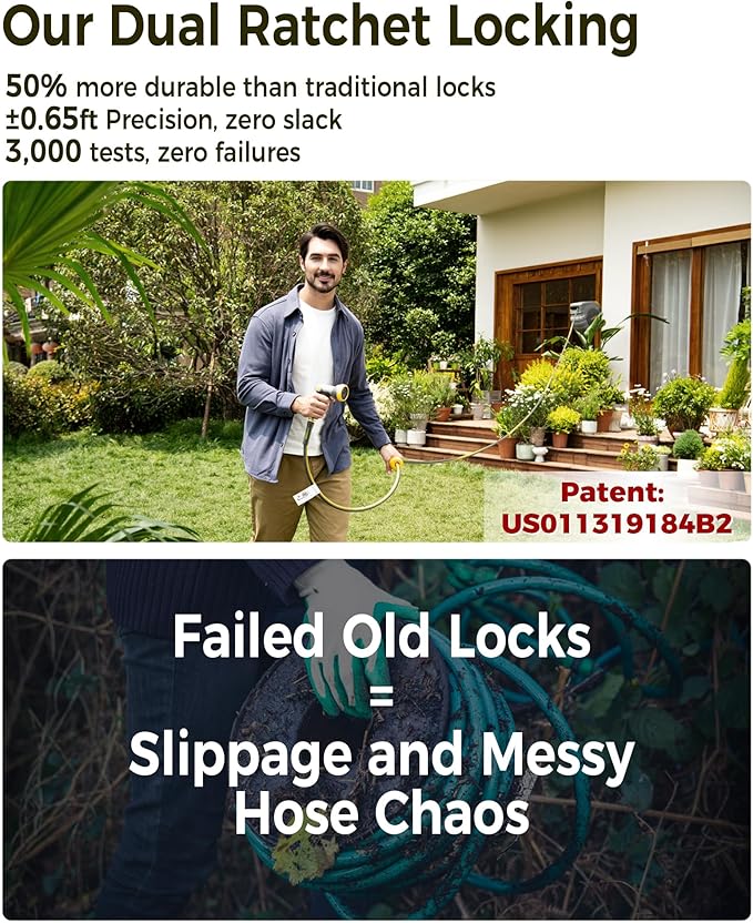 • Precision Dual Ratchet Locking (Patent: US011319184B2): GLAHODEN’s auto rewind water hose reel passes 3,000 rigorous tests with ±0.65 ft locking accuracy. 50% more durable than traditional locks, it eliminates hose slack and secures exact lengths, ensuring precise positioning at balcony corners or garden edges without dragging excess hose