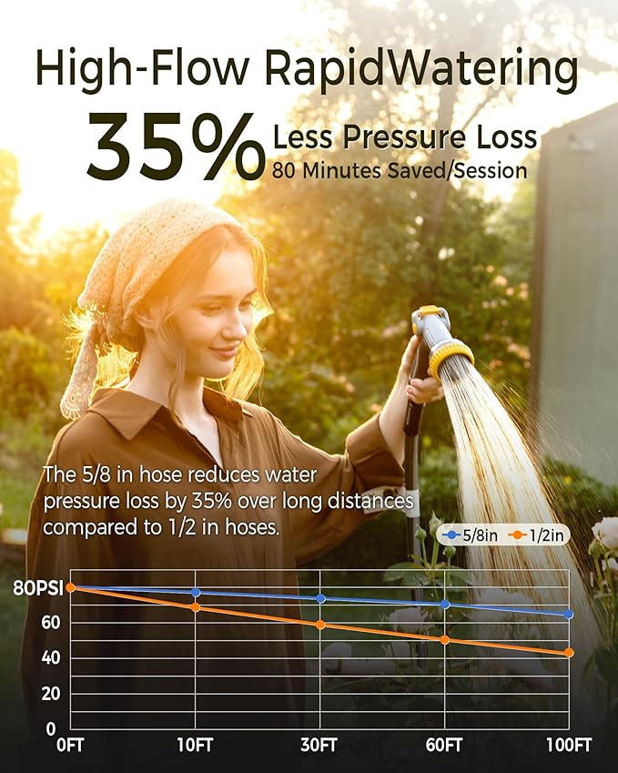 • High-Flow Rapid Watering: The 5/8 in x 100 ft hose on this retractable hose reel reduces water pressure loss by 35% over long distances compared to 1/2 in hoses, saving 80 minutes per session for irrigating basketball court-sized gardens. Ideal for large-scale, high-efficiency tasks