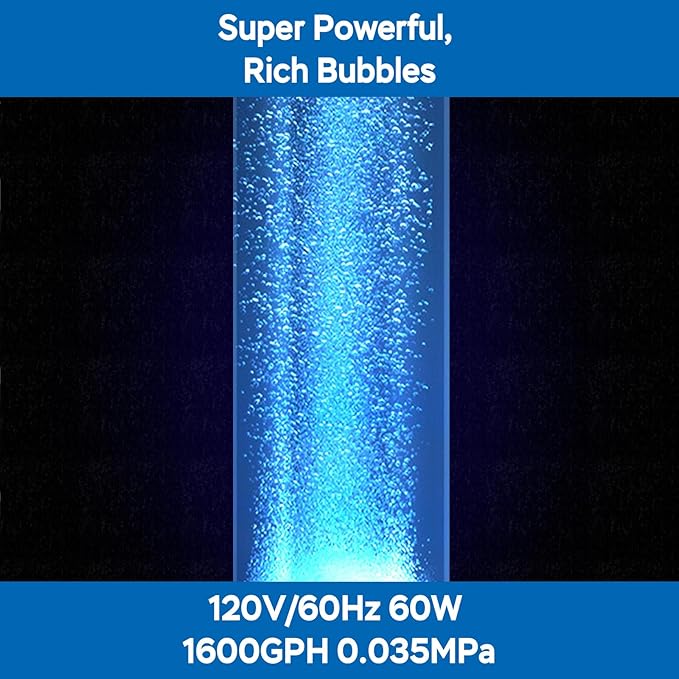 • PERFORMANCE - This pond aerator delivers oxygenation with its 60W full copper coil motor, producing a Max 1600GPH (100LPM) airflow at 0.035MPa pressure. The heavy-duty construction ensures maximum efficiency with minimal power consumption.