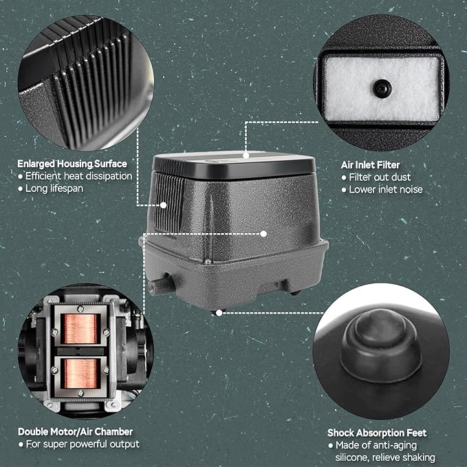 • IMPROVED HEAT DISSIPATION - The enlarged housing surface provides superior heat dissipation, keeping the pond air pump running stably. Perfect for continuous 24/7 operation in ponds, hydroponic air pump systems, or wastewater treatment.