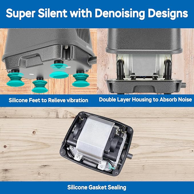 • QUIET - Our linear air pump experiences near-silent performance thanks to our multi-layer noise reduction system: double-layered housing, vibration-absorbing silicone feet, and precision silicone gasket sealing.
