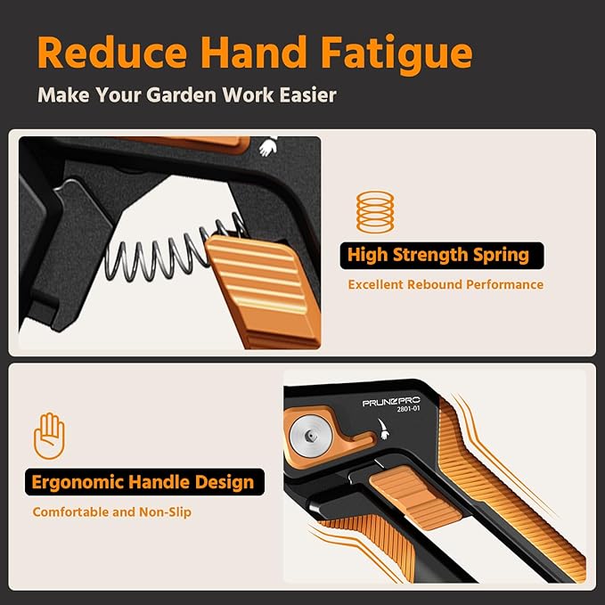 • 【Your Professional Pruning Tool】The Teflon coating enhances sharpness and rust resistance, making every cut easy and clean. Our garden scissors are hassle-free to clean and maintain, requiring minimal care to ensure long-lasting performance and sharpness. Makes PrunePro garden shear a reliable choice for all your gardening needs