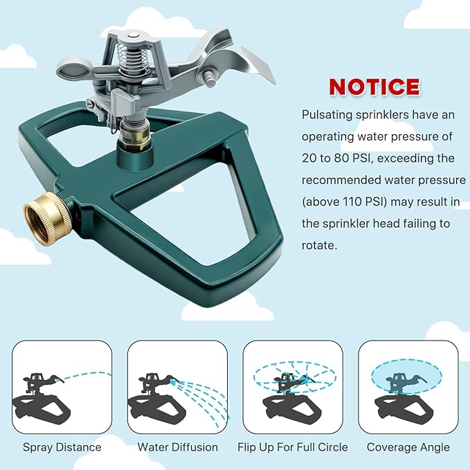 • 【Efficient Water Conservation and Uniform Irrigation】Pulse spray technology ensures even water distribution and reduces water waste. lawn sprinkler suitable for lawns, gardens and large areas, pulsating sprinkler with metal base helping you easily maintain a green and healthy outdoor space. The sprinkler itself has a swivel connection to the hose, ensuring both the sprinkler and the hose can lay flat when installing.