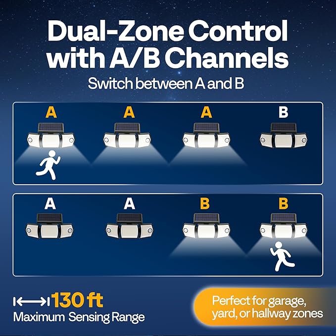 • INDEPENDENT A/B ZONE CONTROL: One slide switch divides lights into A or B modes; When an A-zone sensor triggers, only A-zone lights illuminate (B-zone stays off); Provides precise, energy-saving control for driveways, gardens, and garages. NOTE: For stable linkage, keep units within 130 ft (shorter spacing if obstructed)