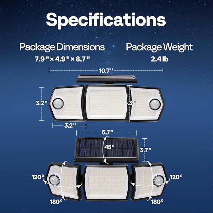 • WIDE-ANGLE MOTION COVERAGE: Dual side panels each includes a sensor with a 120° detection angle and up to 32 ft range; Panels can rotate to customize detection direction for different scenes, expanding coverage to 210° for full-area protection; Position one toward your driveway and the other at your door for “one-light-two-use”; Whether driving home at night or walking into your yard, the light responds when you need it most NOTE: Fully twisting dual side panels outward shortens detection range and may leave blind spots