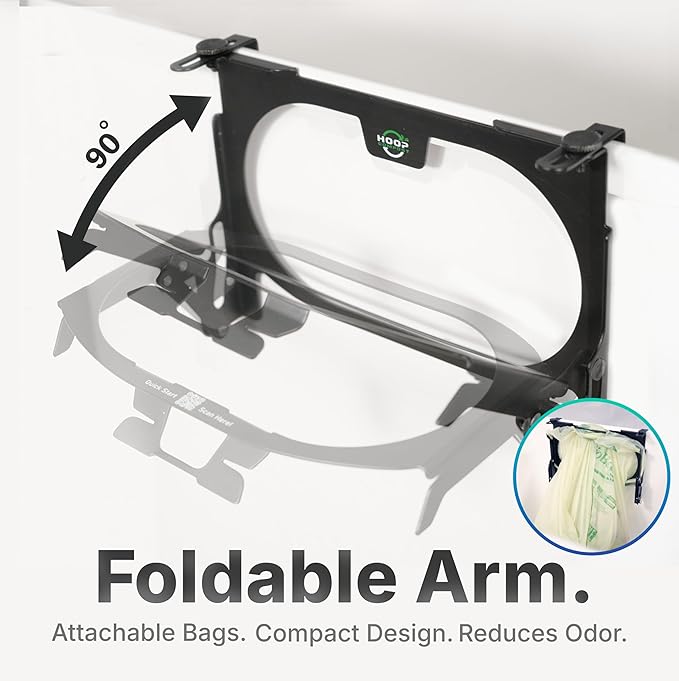 • ✔ Innovative Liftable Arm for Odor Control: Eliminate odors with HOOP’s lift-up arm mechanism. When not in use, simply lift the arm to seal off the compost bag and trap unpleasant smells—keeping your kitchen smelling fresh while your trash stays out of sight.