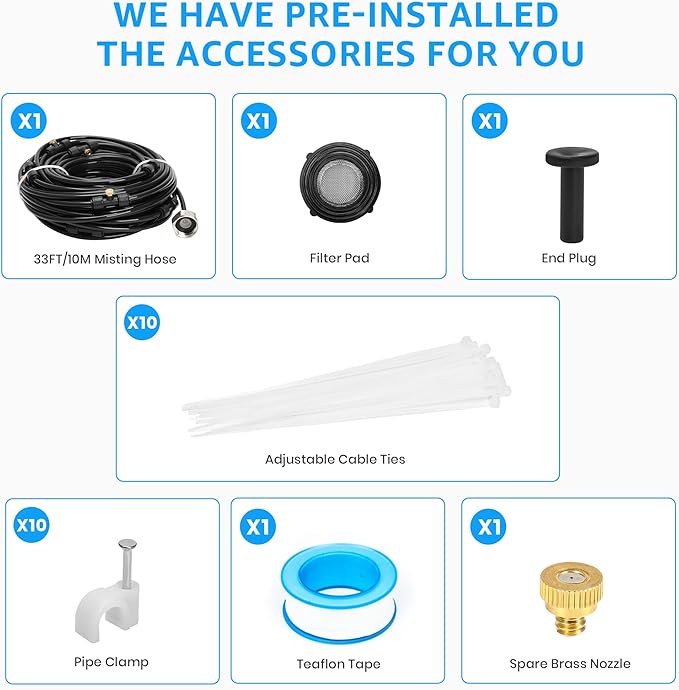 • 【Tool-Free DIY Installation – Customize as Needed】Quick and easy setup—just connect to any standard 3/4" garden hose with the included solid brass adapter. The patio misters for cooling outdoor system is pre-assembled, with extra nozzles and accessories included, allowing full customization for different areas and setups.