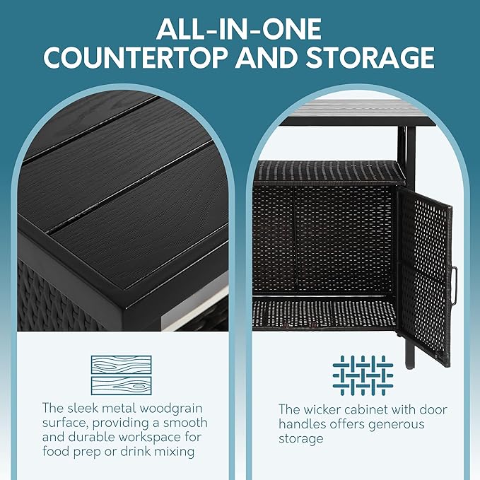• MULTI-FUNCTIONAL: All-in-one outdoor storage and countertop. The wood-like metal serving as an ideal outdoor food prep station.The wicker cabinet with doors features a storage space, providing ample room to store your items