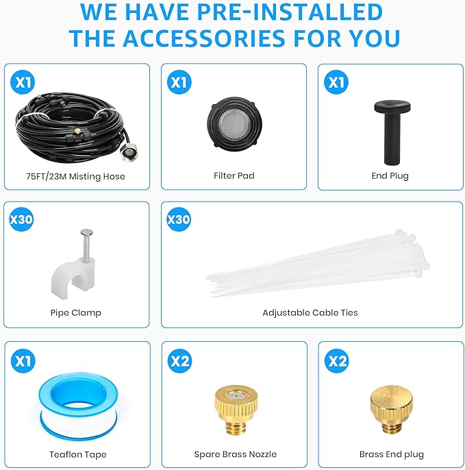 • 【Tool-Free DIY Installation – Customize as Needed】Quick and easy setup—just connect to any standard 3/4" garden hose with the included solid brass adapter. The patio misters for cooling outdoor system is pre-assembled, with extra nozzles and accessories included, allowing full customization for different areas and setups.