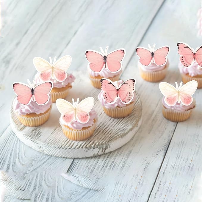 60 PCS Butterfly Cupcake Toppers Edible Butterfly Cake Decorations Edible Butterflies Cupcake Picks for Butterflies Theme Baby Shower Happy Birthday Party Cake Decoration Supllies Pink