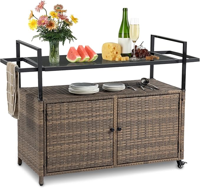 • SPACIOUS RATTAN CABINET: Stay organized with cabinet cart, which includes a large storage cabinet with two magnetic doors. This enclosed outdoor storage cart keeps grilling tools, bar essentials, and outdoor accessories neatly stored