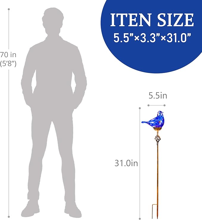 • HANDCRAFTED GLASS DURABLE: Our decorative plant stakes are made of beautiful and intricate color infused by hand blown glass, UV treated to prevent fading, and are designed with a striking metal tip for added elegance and resistance to outdoor elements; Our premium materials ensure our decorative stakes are able to withstand a wide range of outdoor weather conditions