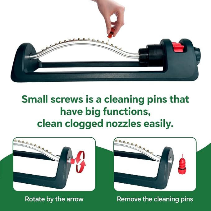 • Easily Clean - If the nozzles get clogged, the sprinkler built in nozzle cleaner at the end of the chassis to clear out clogged nozzle, easy to maintenance.