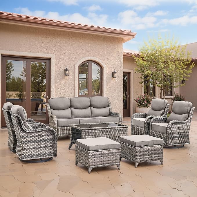 Swivel Patio Chairs sofa Set of 4 with 6" Thick Cushion - Wicker Outdoor Swivel Rocker Patio Chair ,Sofa/Glass coffee table, High Back Comfortable Outdoor Glider Chairs - Grey Wicker | Grey Cushions