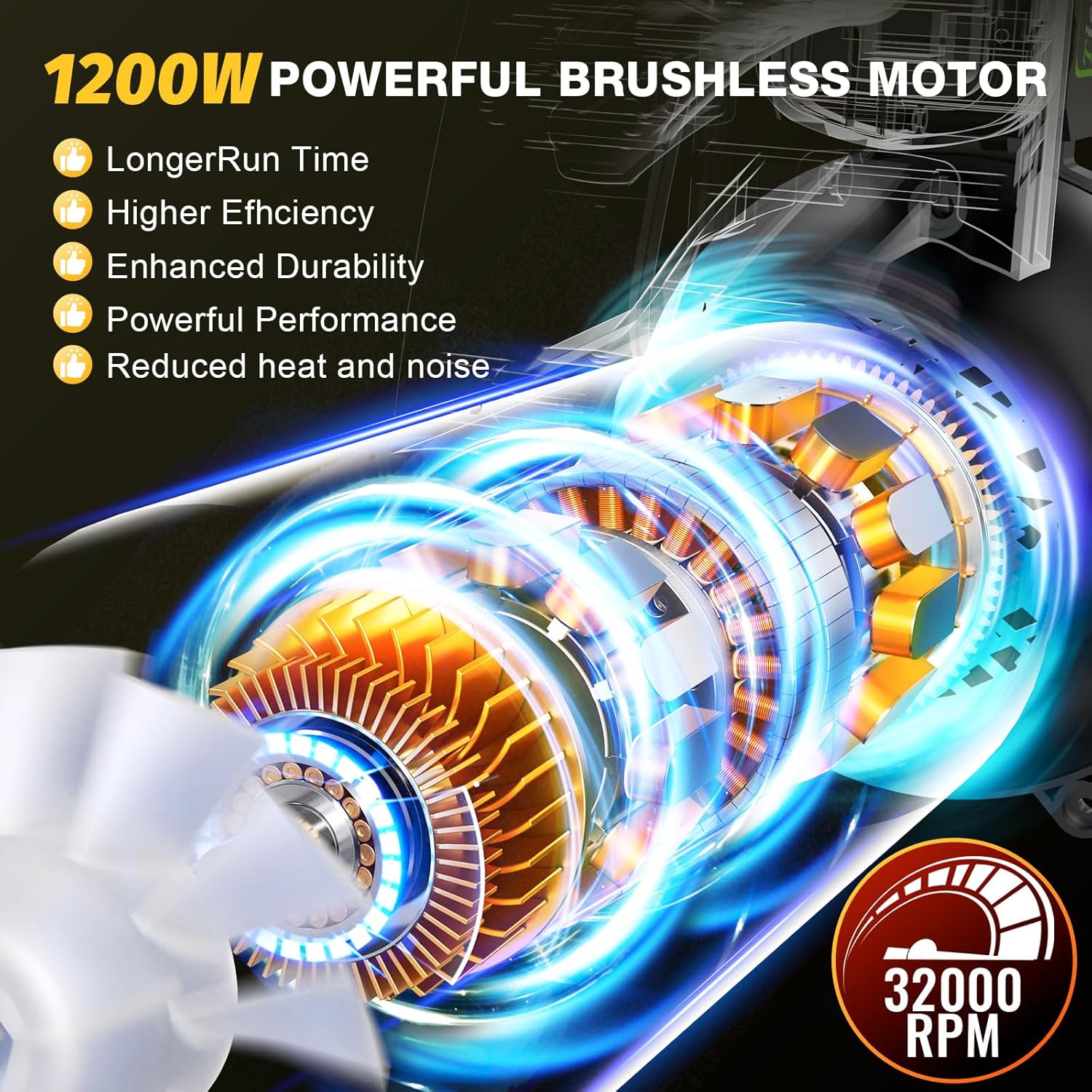 • 𝟑𝟐𝟎𝟎𝟎𝐑𝐏𝐌 𝐏𝐨𝐰𝐞𝐫𝐟𝐮𝐥 𝐁𝐫𝐮𝐬𝐡𝐥𝐞𝐬𝐬 𝐌𝐨𝐭𝐨𝐫: Tietoc cordless leaf blower featuring an advanced brushless motor with a speed of up to 32000RPM, a maximum air volume of 735CFM, a maximum wind speed of 200MPH, it easily blows away fallen leaves, stubborn snow, and deep crevice dust, with a higher cleaning efficiency! In long-term high-intensity work, brushless motors can easily maintain low-temperature stable operation and have a longer working life!