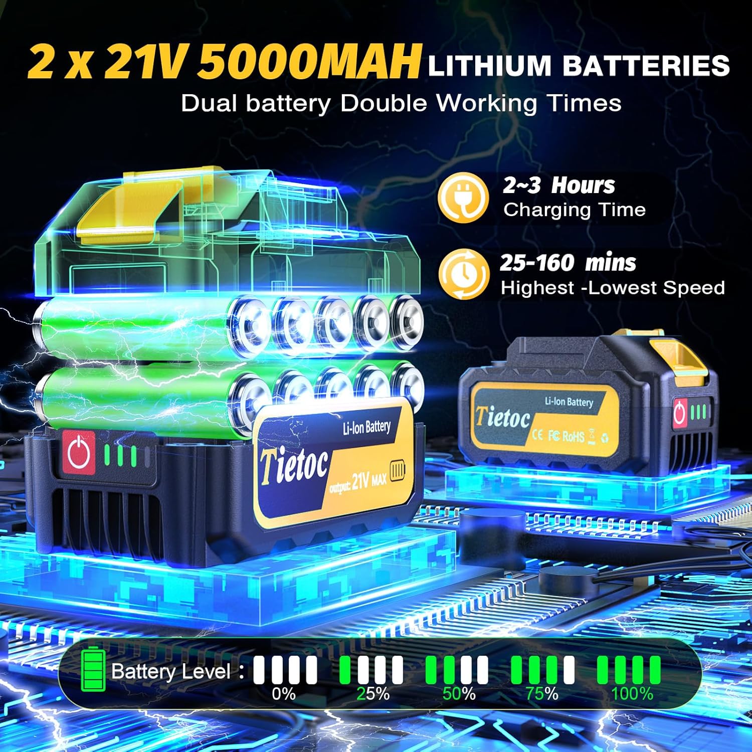 • 𝟐𝐗𝟓𝟎𝟎𝟎𝐦𝐀𝐡 𝐁𝐚𝐭𝐭𝐞𝐫𝐲 𝐋𝐨𝐧𝐠-𝐥𝐚𝐬𝐭𝐢𝐧𝐠 𝐄𝐧𝐝𝐮𝐫𝐚𝐧𝐜𝐞: Battery powered leaf blower with two 21V 5.0Ah high-capacity lithium batteries and a safety charger. Users can charge one while using the other, enabling theoretical "infinite runtime"—ideal for continuous tasks like yard cleaning and lawn maintenance. 2 batteries can last at most 25 minutes at highest speed and 160 minutes at lowest speed. The batteries are equipped with overheat protection, which is safe and reliable