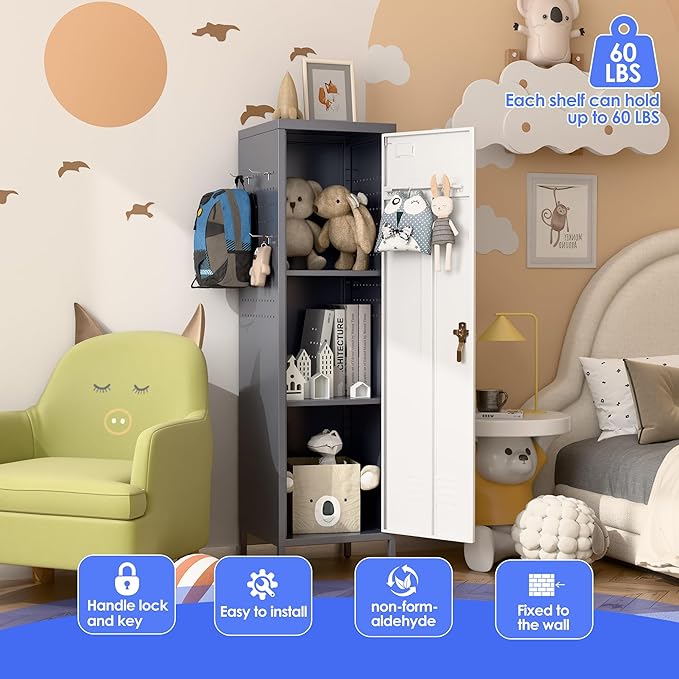 • 【Metal Construction】Locker made of powder-coated metal with 2 shelves, provide 3 layers space for storage no matter where you need it. Each shelf can hold up to 60 lbs. The top surface can support up to 60 lbs. The metal can easily be cleaned with a damp cloth
