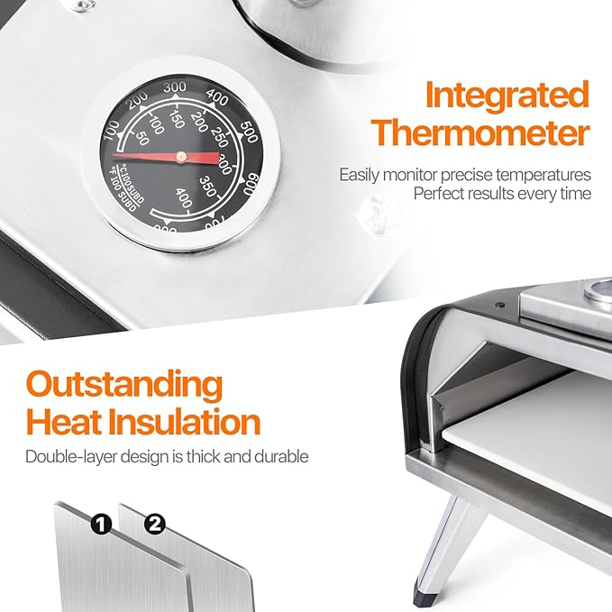 • Done in Minutes: Our outdoor pizza oven has a built-in thermometer so you can easily monitor the temperature inside the oven to track cooking progress. Heats up to 752°F in just 15 minutes and reaches a maximum temperature of 1,022°F. When preheated, the 13'' cordierite pizza stone bakes pizzas to crispy perfection in 90 seconds or less, as well as steaks, fish, lamb chops, burgers, salmon, vegetables and more