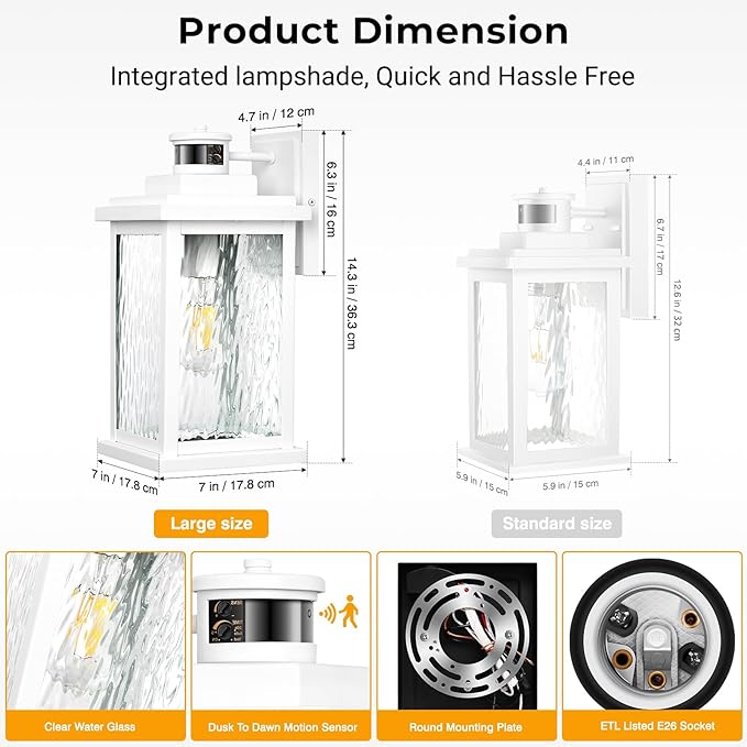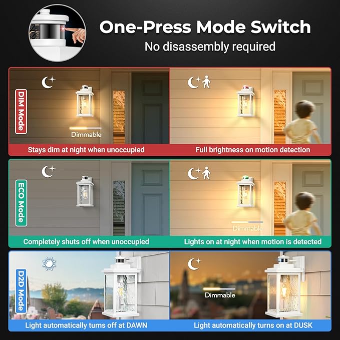 • [One-button Mode Switching & Dual Knob Setting] You can easily switch to ECO or DIM or D2D mode at any time with a touch of the sensing button, and the motion sensors of outdoor lanterns for porch remember your last setting. In addition, you can adjust the porch lights outdoor sensors' detection range or the lighting holding time just by turning a knob. It's easy to enjoy smart, energy-efficient living without having to understand complicated programs.