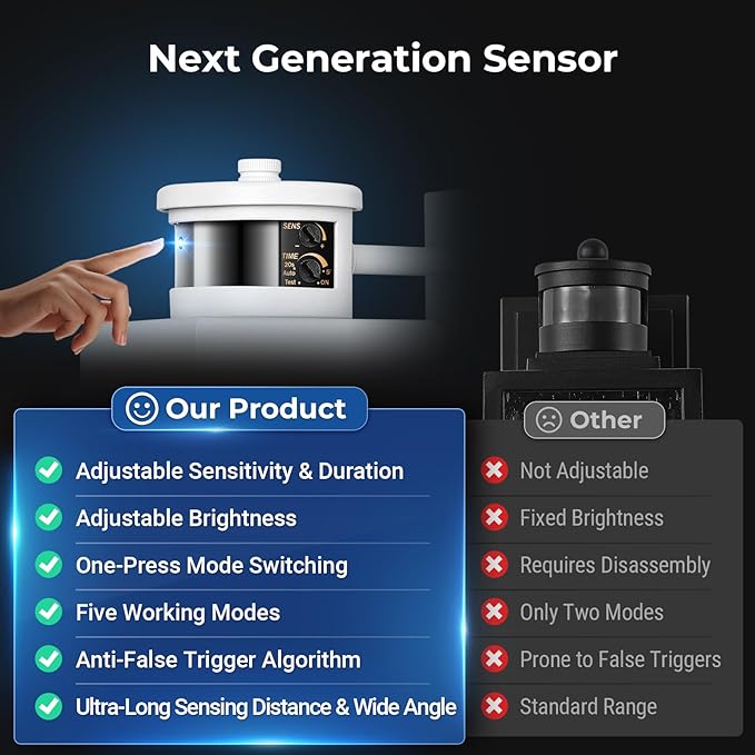 • [5 Lighting Modes] Giving your lights unlimited possible! ①DIM and ECO+ Mode: 100% light once motion is detected(DIM keep 30% brightness on night while ECO+ MODE keep off on night). ② D2D Mode: Automatically turn on throughout the night and off during the day, with motion detection disabled. ③ Override Mode: 100% On for 8 hours. Then resume previous working mode. ④ On Mode: It will be controlled solely by your light switch for turning on and off with all sensor functions disabled.