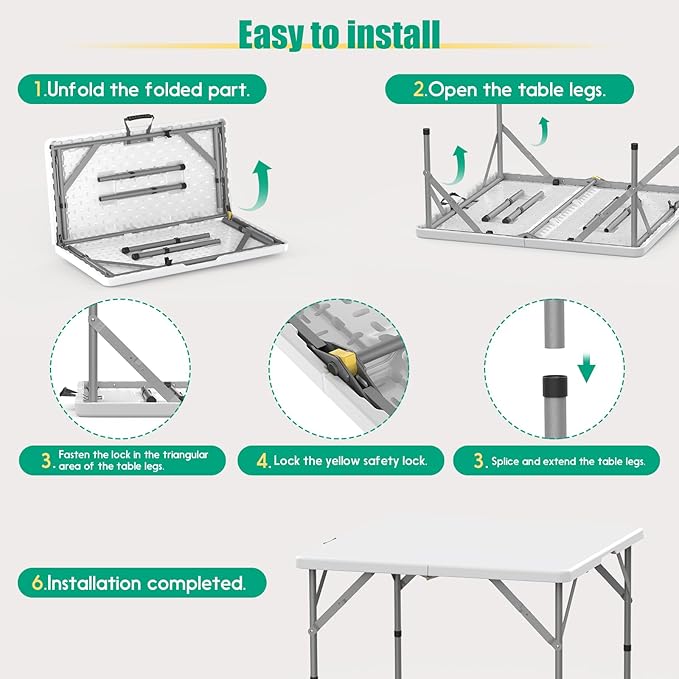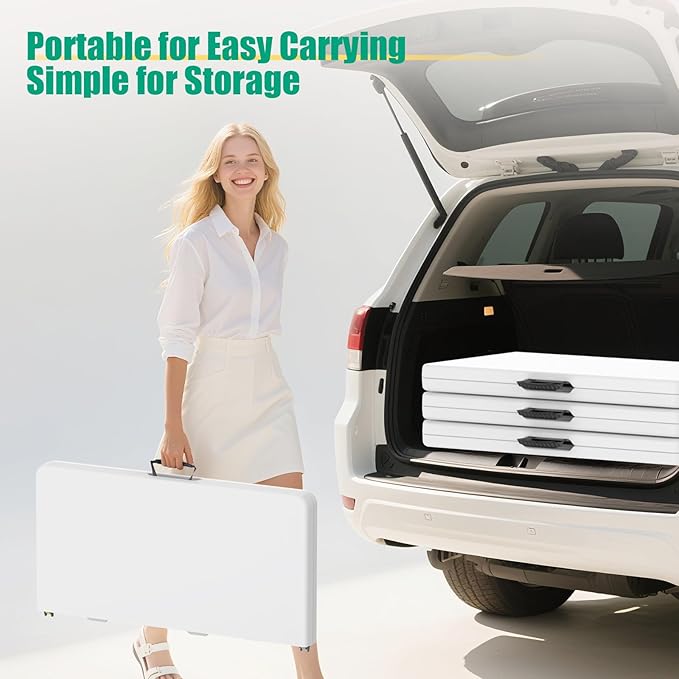 • Portable & Convenient: With a compact, foldable design, this plastic folding table comes with handles can be easily transported and stored, making it an ideal choice for on-the-go use and storage