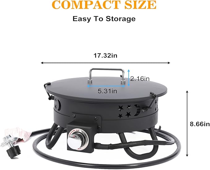 • Portable & Compact Design: Designed for convenience, this fire pit features foldable legs and a compact folding size of 17" x 8" for easy transport and storage. It comes equipped with a 10 ft preassembled gas hose, lava rocks, hose hooks, a carrying strap, propane tank holder, and a secure lid.