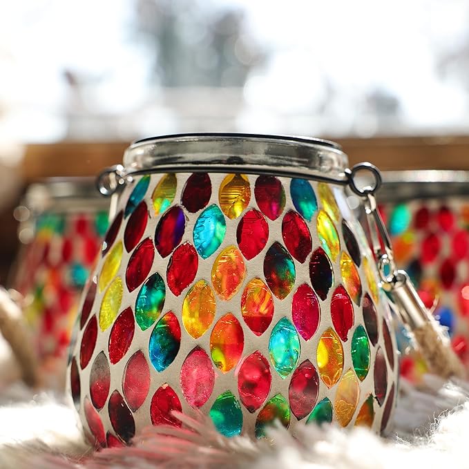 • 《Ruby Mosaic That Glows with Personality》Hand-placed oval mosaic glass tiles in rich red tones wrap around the entire lantern, creating a dazzling play of color. In the daylight, the glass refracts sunbeams like stained glass; by night, Passionate light shines through the mosaic to cast a vibrant, romantic glow in your garden.