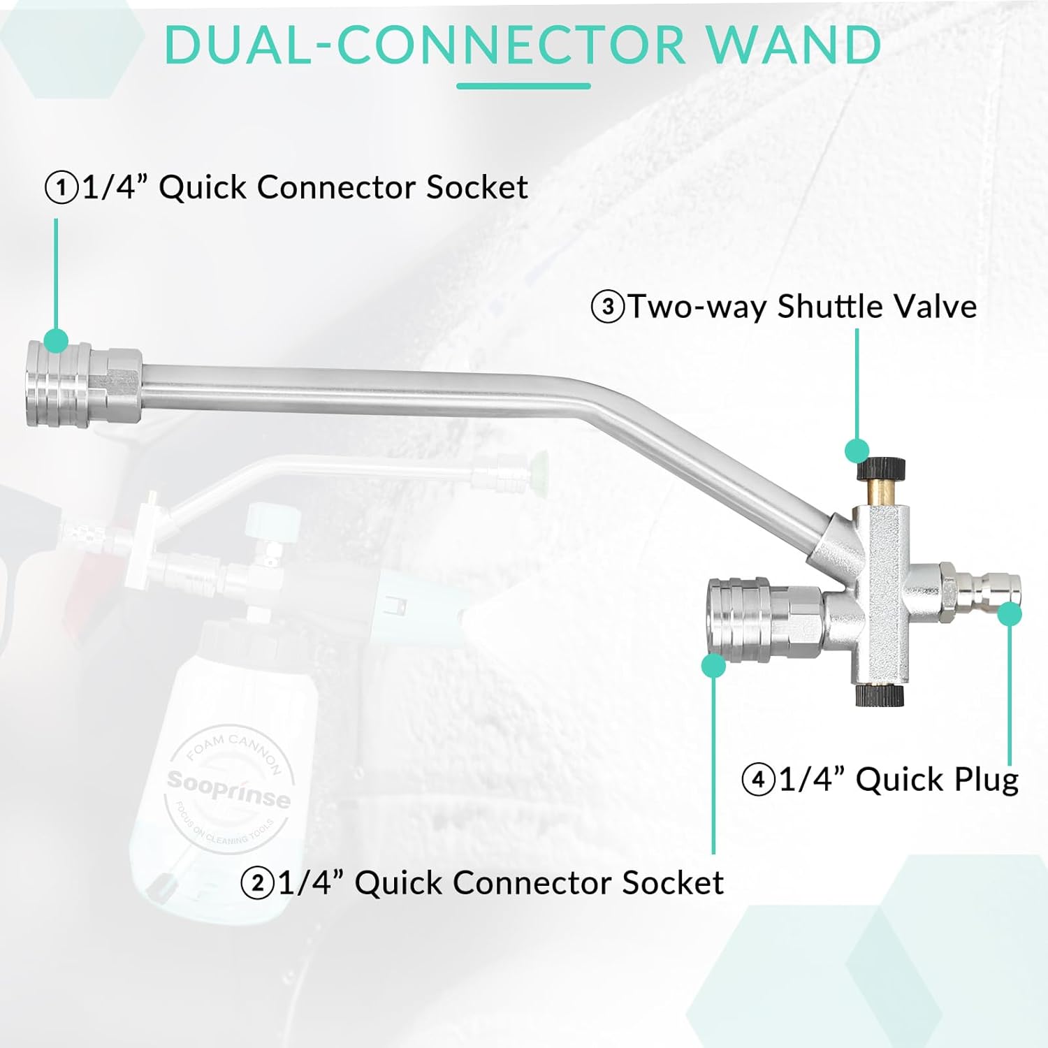• 【Double-ended Design】 The foam cannon dual connector has a unique double-ended setup. One end is longer for the pressure washer nozzle, and the shorter end is for the foam cannon. This design ensures smooth water flow when using the nozzle, even with the foam dispenser attached.