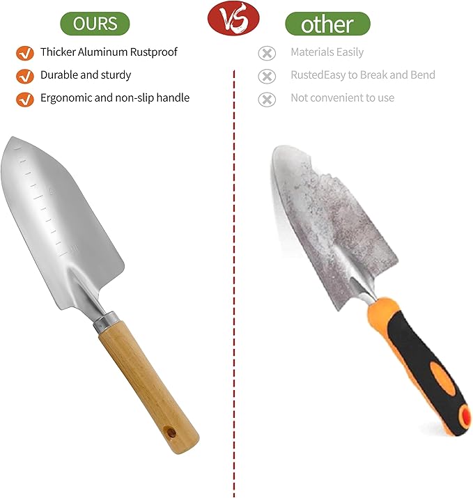 • 🌷DURABLE, HIGH-QUALITY HAND TOOLS – This set includes a hand trowel, transplanter, rake, fork, and weeder, all made from premium rust-resistant metal with ergonomic anti-slip handles to maximize comfort and durability.