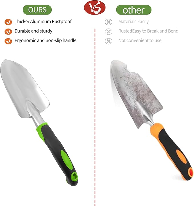 • 🌷DURABLE, HIGH-QUALITY HAND TOOLS – This set includes a hand trowel, transplanter, rake, fork, and weeder, all made from premium rust-resistant metal with ergonomic anti-slip handles to maximize comfort and durability.