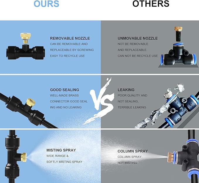 • 💧【Durable and Leak-Proof Misting Nozzles】: The Bonviee Misting System is equipped with brass misting nozzles that provide a smooth and consistent spray. These nozzles are brass to ensure long-lasting durability. The system’s no-leak design ensures optimal performance, making it perfect for misting cooling systems in backyards, patios, or greenhouses.