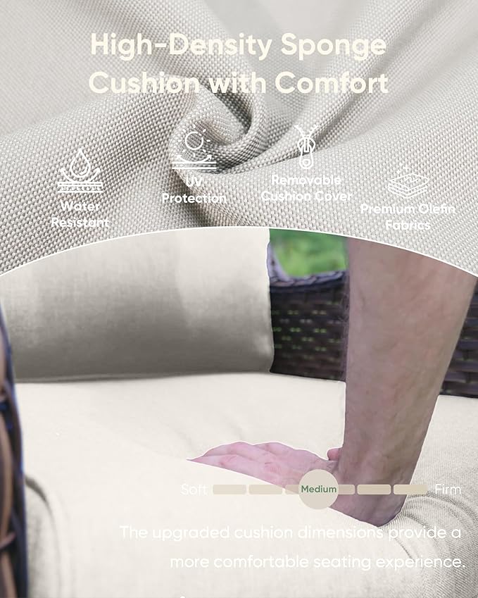 • 【All-Weather-Resistant Durability】Crafted with powder-coated rust-resistant steel frames and hand-woven UV-stabilized PE wicker, the patio set withstands outdoor elements. Water-repellent cushion covers and reinforced joints ensure stability in rain or humidity, tested for long-term outdoor use.