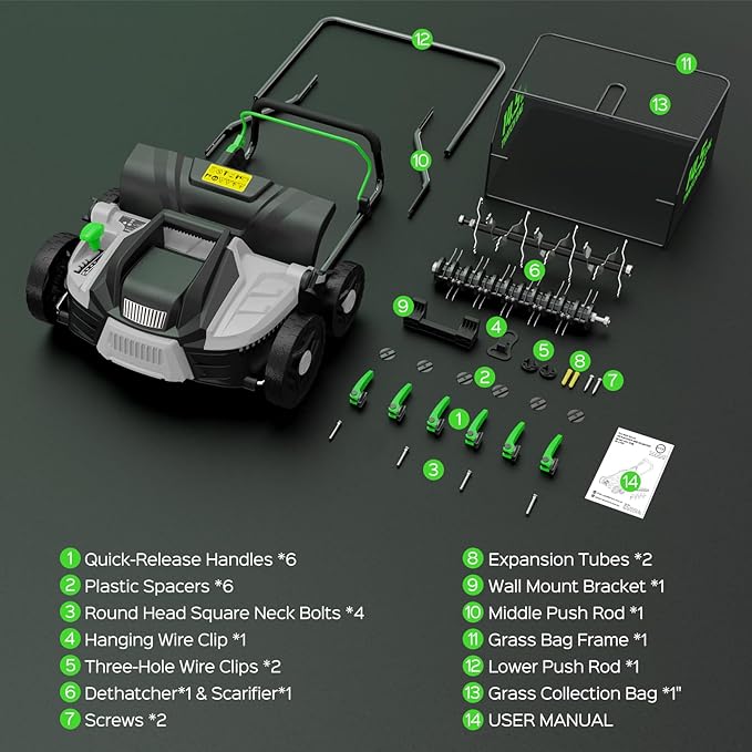 • RELIABLE AND CONVENIENT FEATURES: The scarifier and lawn dethatcher include a waterproof plug for safety, a cord clip to keep cables tidy, and an extension cord holder to prevent cord tangling. Durable wheels ensure smooth movement, while the large 14.5-gallon removable collection bag makes debris cleanup easy and reduces how often you need to empty it. These practical features make lawn care simpler and more efficient overall