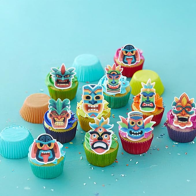 • 【Tiki Tribal Masks theme Party Supplies】: 54Pcs Edible Tiki Tribal Masks Cupcake Toppers are perfect for hawaii tiki theme party, tiki totem theme party, summer tropical luau aloha theme party, baby shower theme party, kids boys girls birthday theme cupcake decorations, they will make your cupcake more attractive and bring the fun to your party, make your guests fall in love with them!