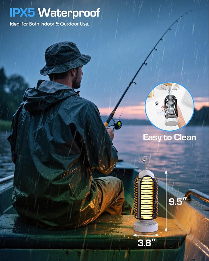 • IPX5 Waterproof & Easy to Clean: Built with an IPX5 waterproof rating, this portable mosquito zapper outdoor handles rainy conditions with ease for safe, reliable outdoor use. The bug zapper outdoor cordless features a magnetic hook for easy hanging or stable placement on flat surfaces. The small brush makes this fly killer easy to remove insects stuck to the grid. Note: Do not immerse in water. Whether indoors or outdoors, keeping bothersome insects at bay is effortlessly achievable.