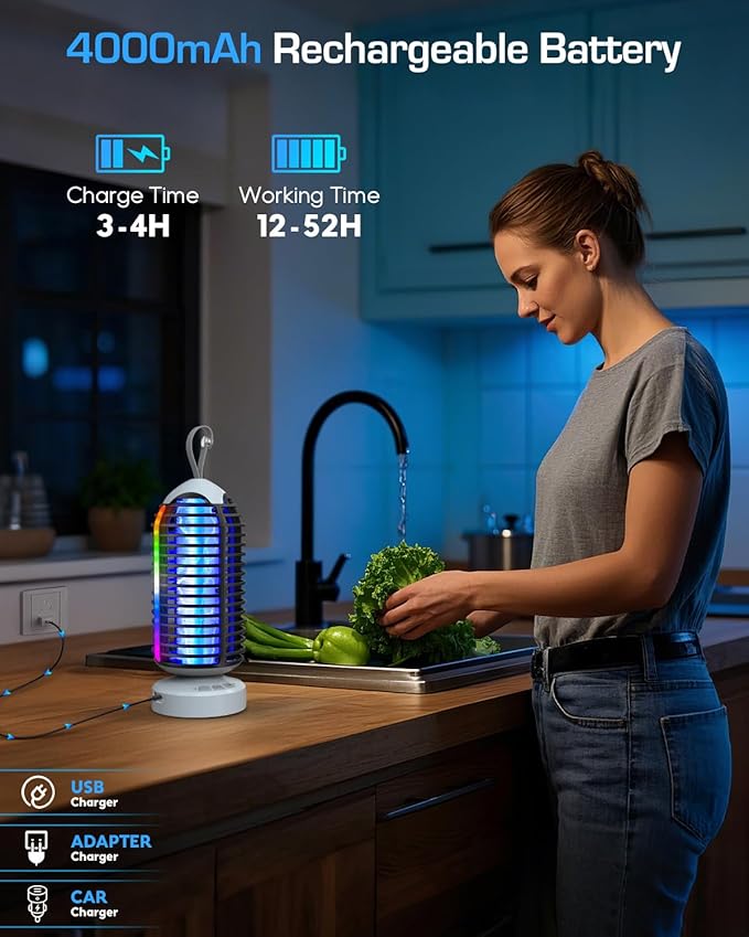• 4000mAh Rechargeable Battery: This indoor fly zapper features a high-capacity 4000mAh battery, offering extended runtime: 12–16 hours in mosquito light mode, 7–18 hours in night light mode, and 17–52 hours in ambient light mode.With quick USB-C charging, it takes just 3-4 hours to fully recharge. Enjoy the freedom of cordless operation—whether at home or on the go, its portable, cordless design ensures continuous mosquito protection, letting you sleep peacefully without interruption.