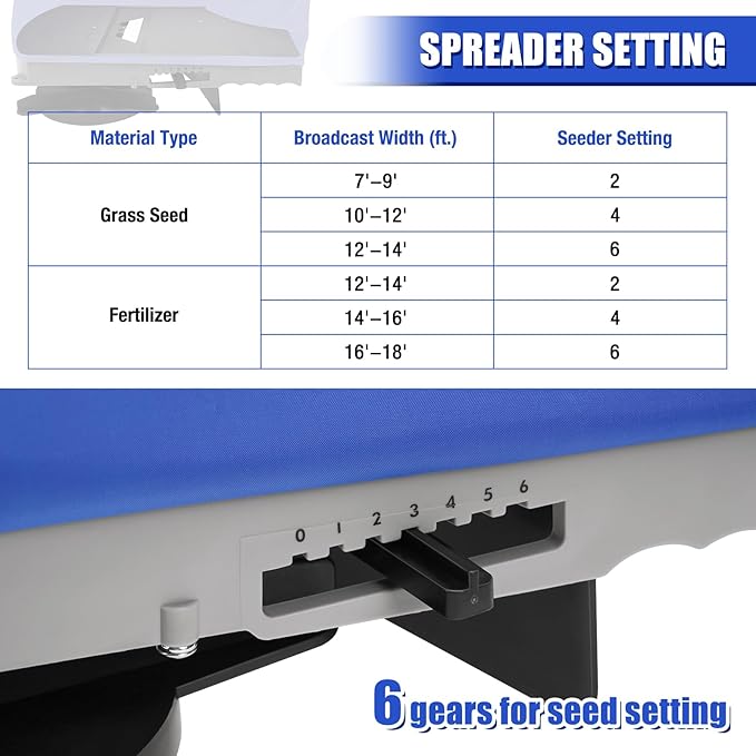 • Diverse Spreading Choices: Easily adjust the gate opening to match your material; Spread seeds and fertilizers with 6-level gate adjustments; The large impeller ensures even and wide distribution of material