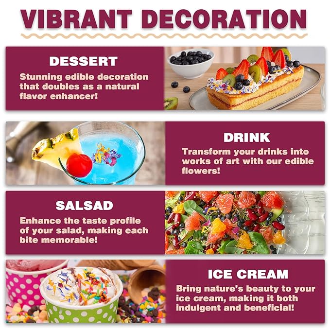 • Gourmet Versatility: Elevate your dishes to a new level of sophistication! These edible flowers are perfect for decorating cakes, salads, drinks, and ice cream. A simple sprinkle adds an instant burst of vibrant color and a delicate floral fragrance, transforming ordinary recipes into visually stunning, aromatic masterpieces.