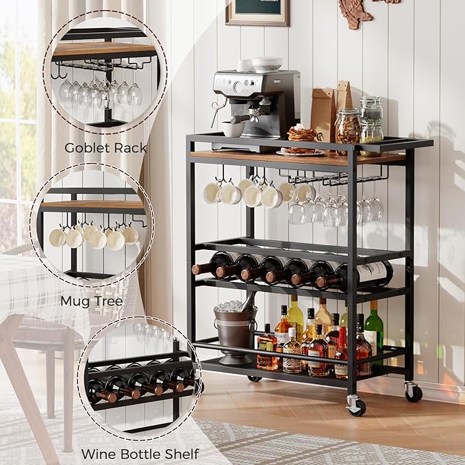 • All-in-One Bar Cart: This multi-functional bar cart features 3 layers, including a wine bottle rack, glass holder, mug rack, and 2-tiered shelves with guardrails, making it ideal for storing liquor, dining ware, ice buckets, and desserts for all your party needs