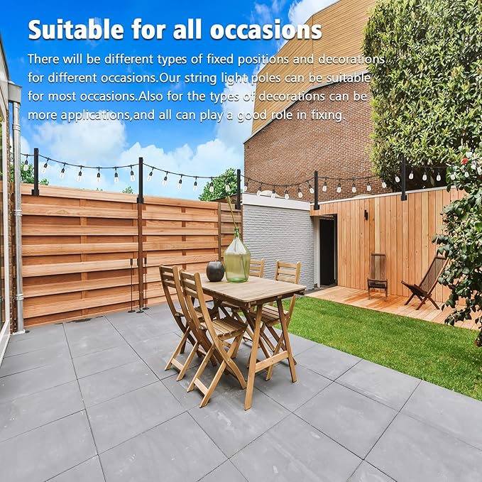 • No height restrictions:Made of high quality metal, it will not bend or wobble. The poles for string lights is not limited by its own length, and the excellent load-bearing properties allow you to install it on high fences and walls. Get rid of the general height limitation. You can also hang more number of strings of lights. Also can be applied to banners, lanterns, wind chimes, all kinds of light decoration, etc.