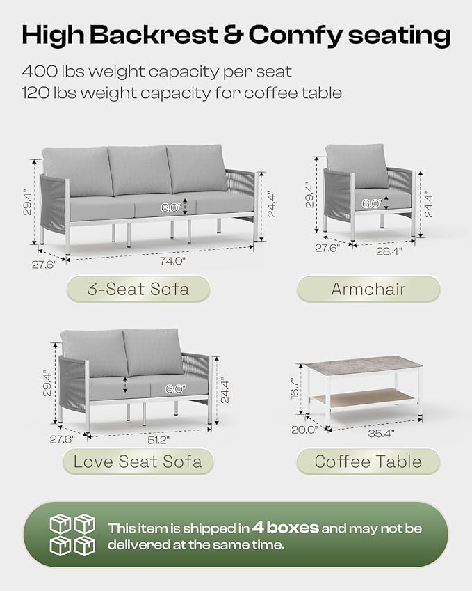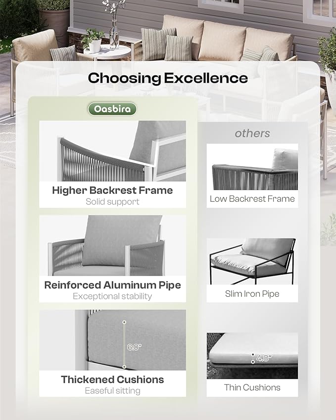 • 【Ultimate Comfort】 The cushions of the Oasbira patio furniture set are filled with honeycomb structure foam, offering exceptional comfort. This outdoor seating furniture features an elevated backrest frame reaching 29.4 inches, providing support that far beyond average patio sets. Each seat is 23.6 inches wide, offering ample space and ensuring ergonomic relaxation.