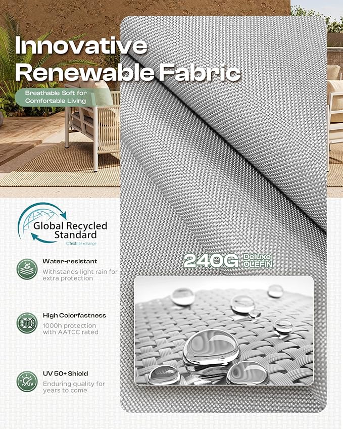• 【Durable Design】 The modern outdoor furniture features a superior aluminum frame that is far stronger and more durable than typical metal frame. And the anodized finish enhances durability and stability. The Olefin fabric combines durability with UV protection for years of outdoor enjoyment. The HDPE handcrafted rope has exceptionally high strength, offering greater load-bearing capacity than regular wicker, setting it apart from other wicker outdoor furniture.