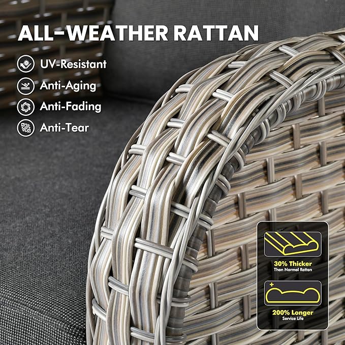 • All-Weather Patio Modular Sectional Sofa Set:Built to last, our All-Weather Patio Modular Sectional Sofa Set is crafted with premium, handwoven PE rattan, designed to withstand rain, snow, and blazing sun. Whether hosting guests or relaxing solo, this patio conversation set — including the outdoor sofa and chair — resists stains and is water-repellent, ensuring effortless maintenance for a pristine backyard oasis