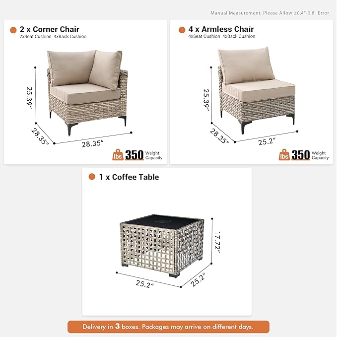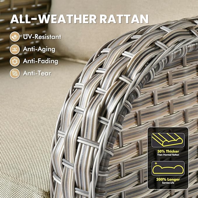• All-Weather Patio Modular Sectional Sofa Set:Built to last, our All-Weather Patio Modular Sectional Sofa Set is crafted with premium, handwoven PE rattan, designed to withstand rain, snow, and blazing sun. Whether hosting guests or relaxing solo, this patio conversation set — including the outdoor sofa and chair — resists stains and is water-repellent, ensuring effortless maintenance for a pristine backyard oasis